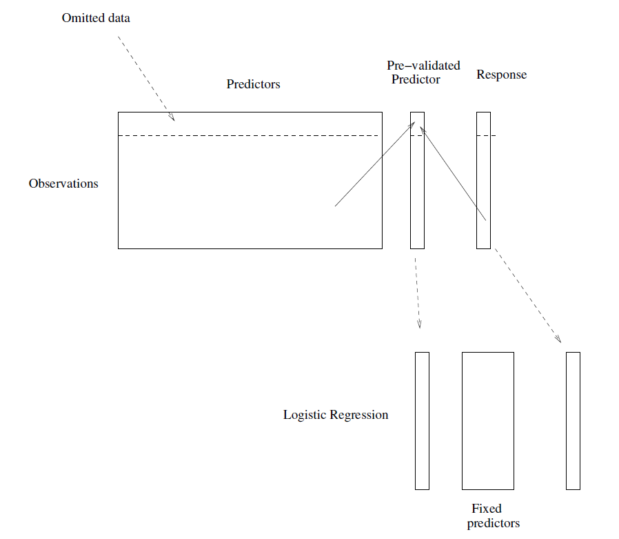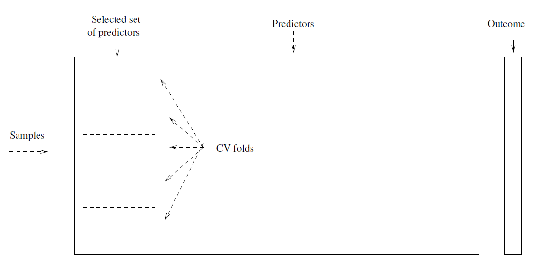 - We leave out part \(k\), fit the model to the other \(K-1\) parts (combined), and then obtain predictions for the left-out \(k\)th part.