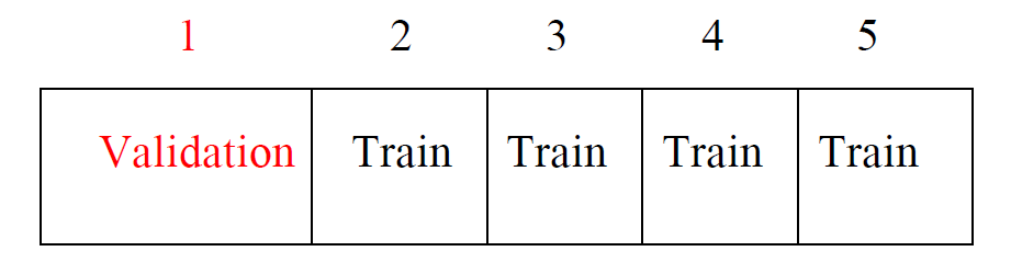 Devide data into \(K\) roughly equal-sized parts (\(K=5\) here)