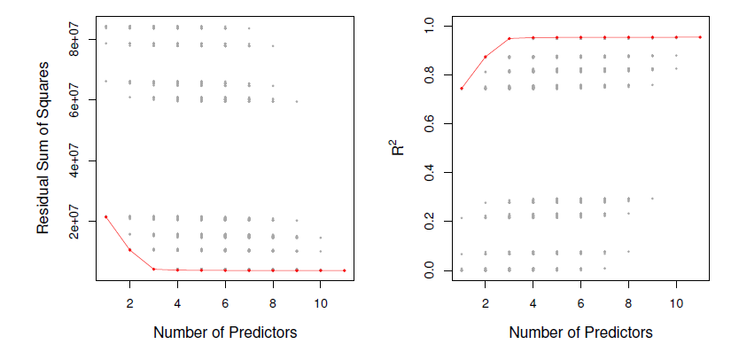 - The red frontier tracks the best model for a given number of predictors, according to RSS and \(R^2\).