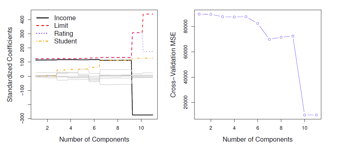 - Though the data set contaings only ten predictors, the \(x\)-axis ranges from 1 to 11, since one of the variables is categorical and takes on three values, leading th the creation of two dummy variables.