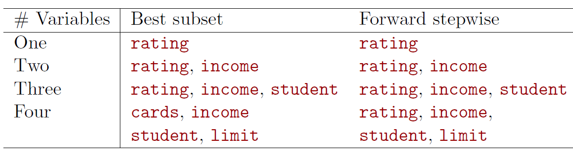 - The first four selected models for best subset selection and forward stepwise selection on the Credit data set.