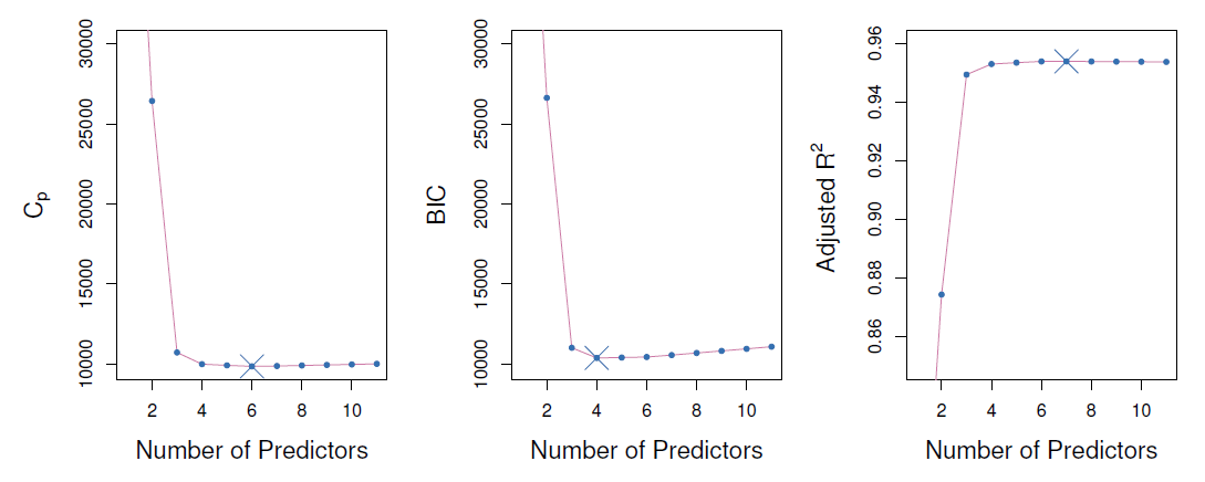 - Select a single best model from among \(M_0, \ldots, M_p\) using cross-validated prediction error, \(C_p\) (AIC), BIC, or adjusted \(R^2\).