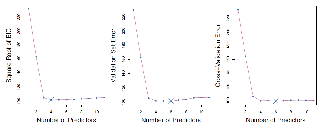 - Select a single best model from among \(M_0,\ldots, M_p\) using cross-validated prediction error, \(C_p\) (AIC), BIC, or adjusted \(R^2\).